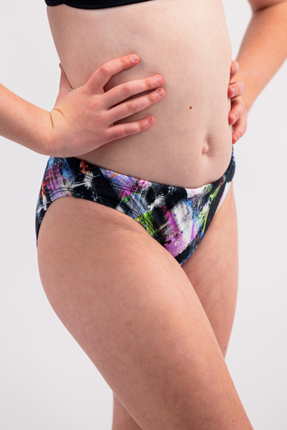 This bikini Brief bottom has full front lining, a draw cord with wide elastic top to its bottom of extra hold and is reinforced at all stress points.