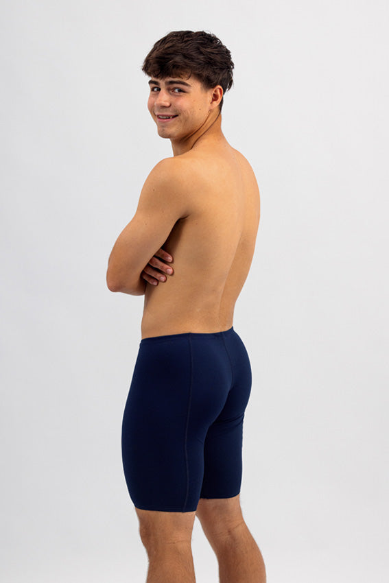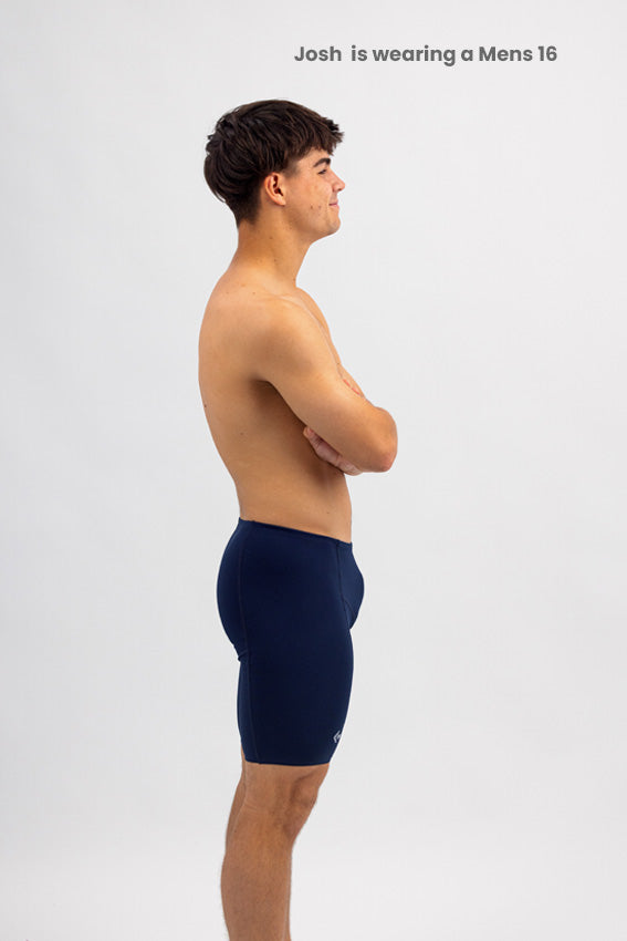 Our Model is wearing a Mens 16 for a firm fit for swim training.